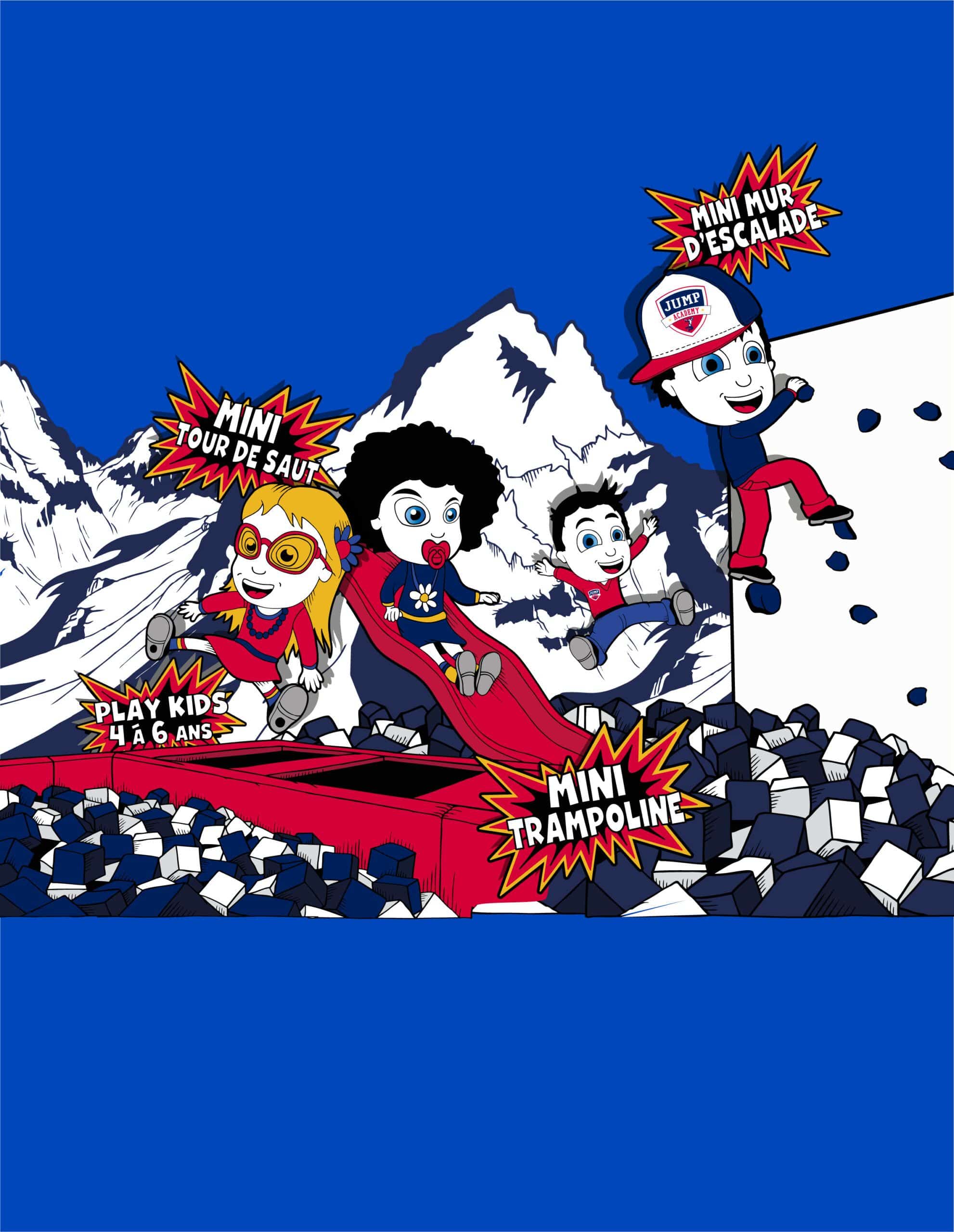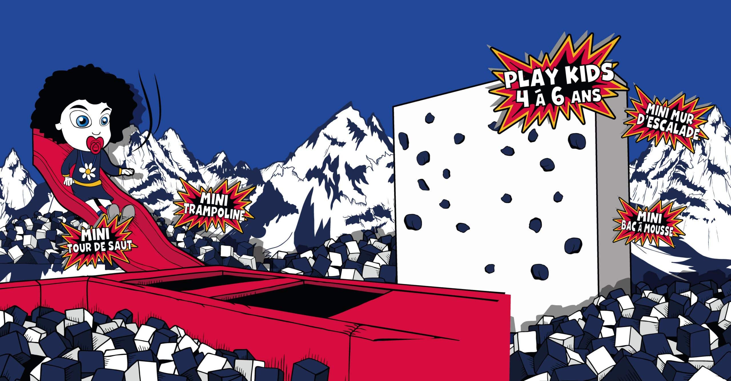 Un espace dédié aux plus jeunes de 4 à 6 ans, Trampolines, bac à mousse, tour de saut et mur d’escalade, tout ce dont un enfant à besoin pour s’amuser en sécurité.